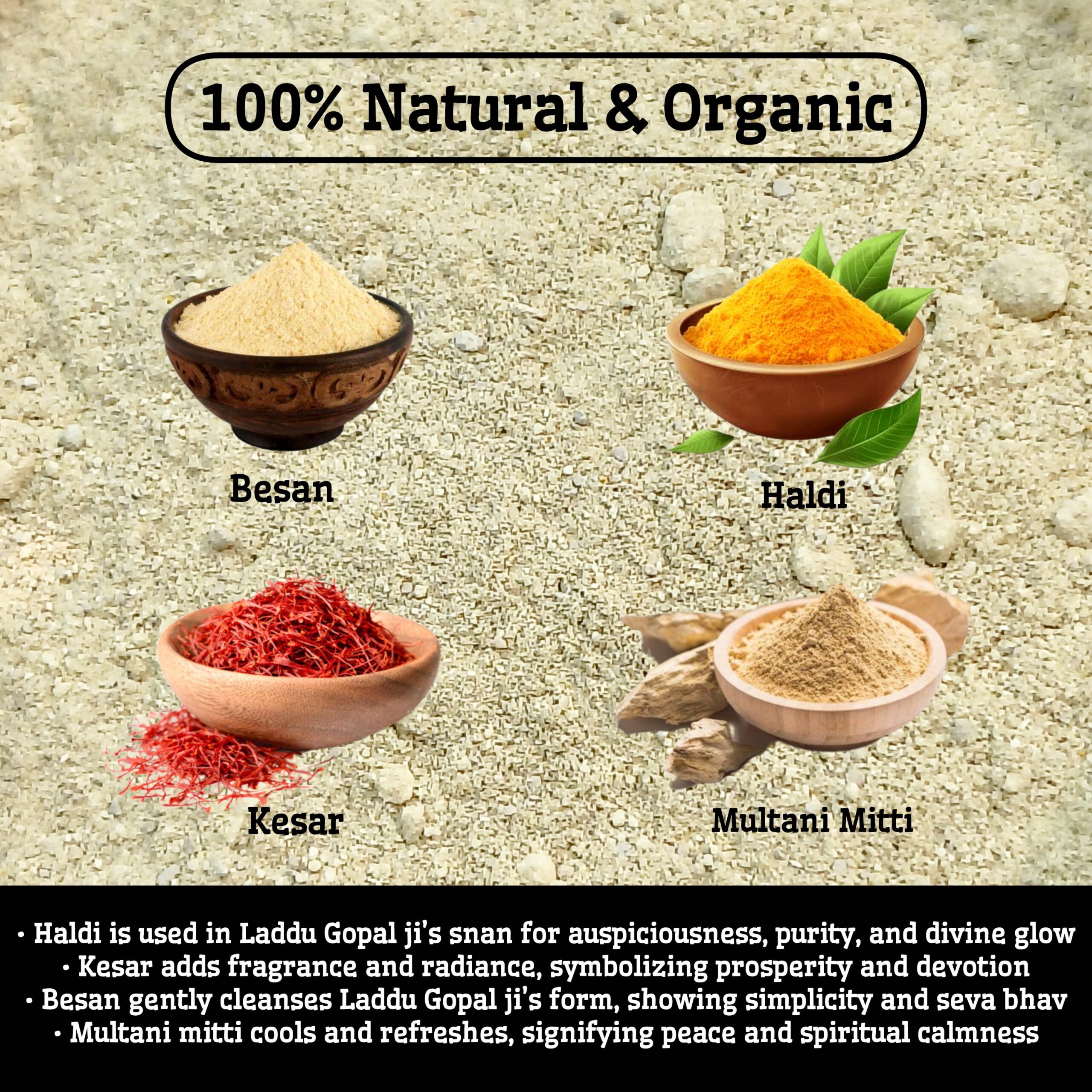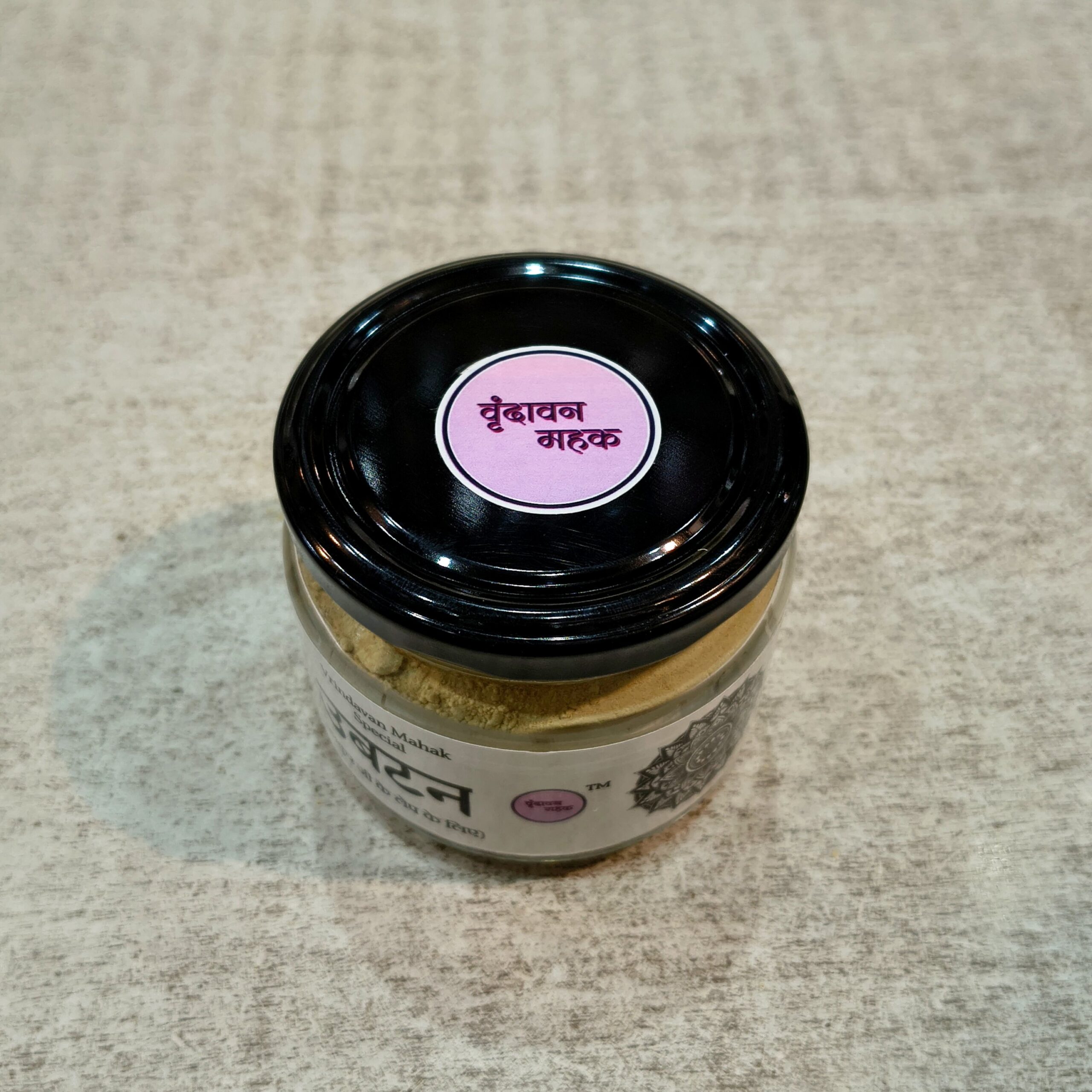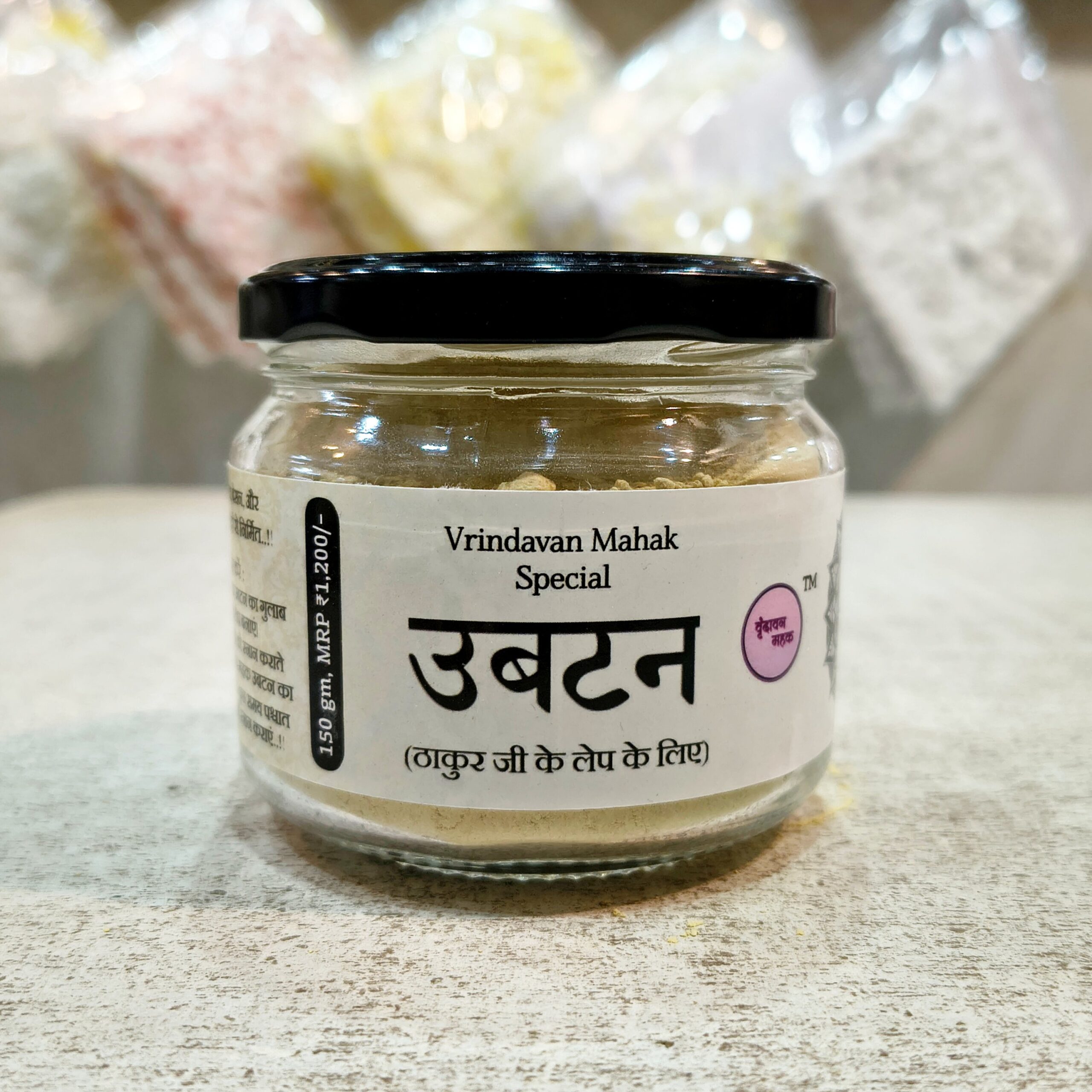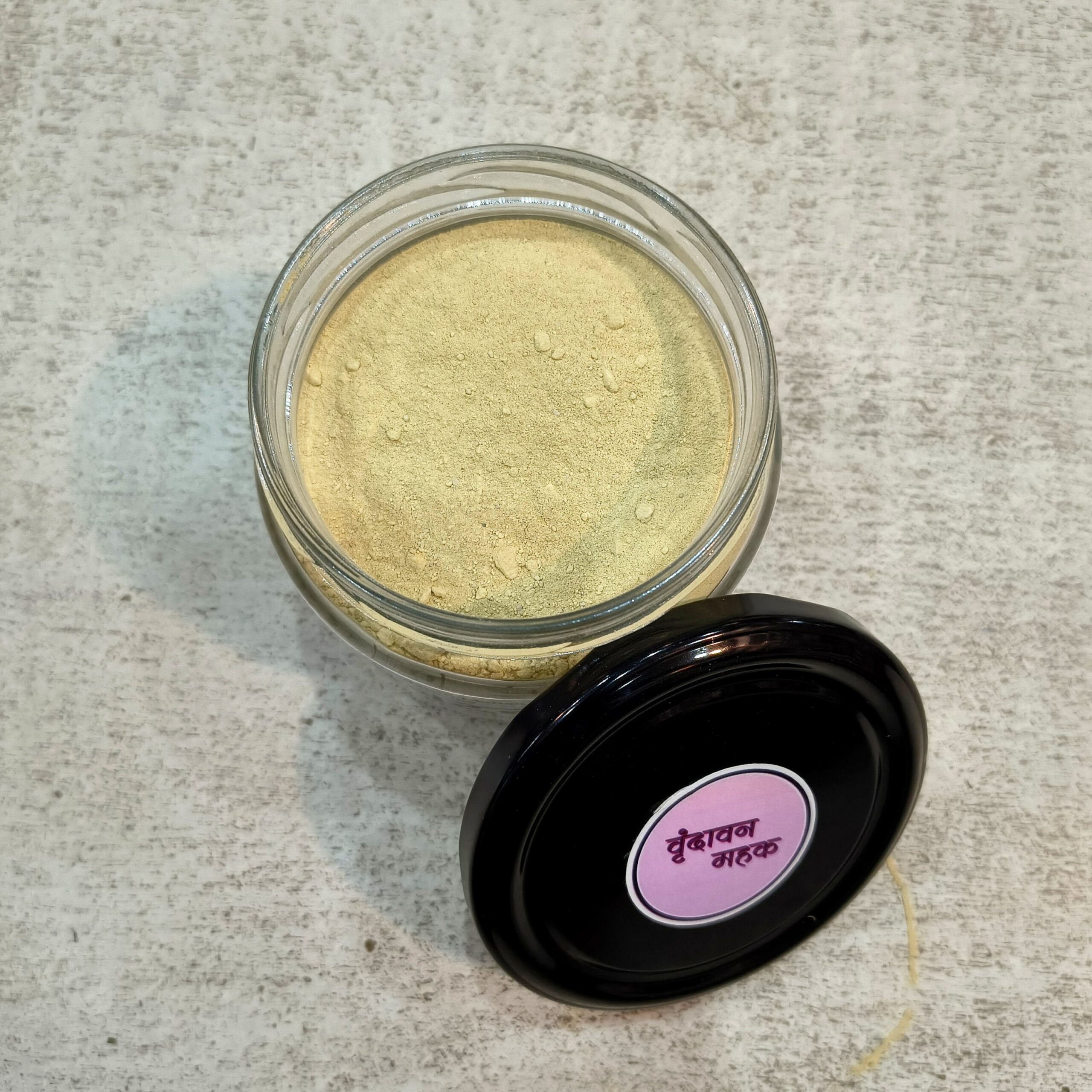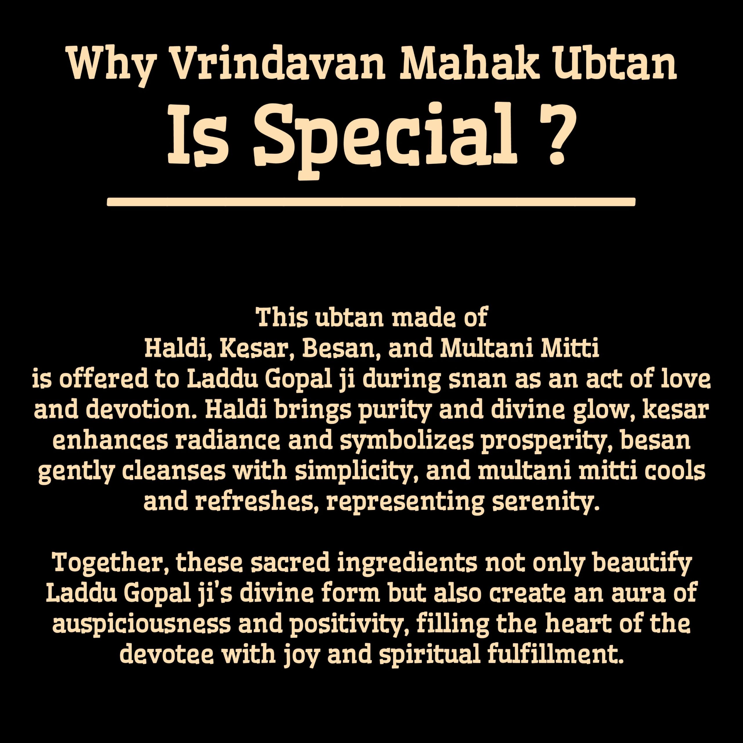 Vrindavan Mahak Ubtan with Besan, Haldi, Kesar, and Multani Mitti, handmade and natural, for Laddu Gopal Ji’s snan with devotion, purity, and spiritual care.