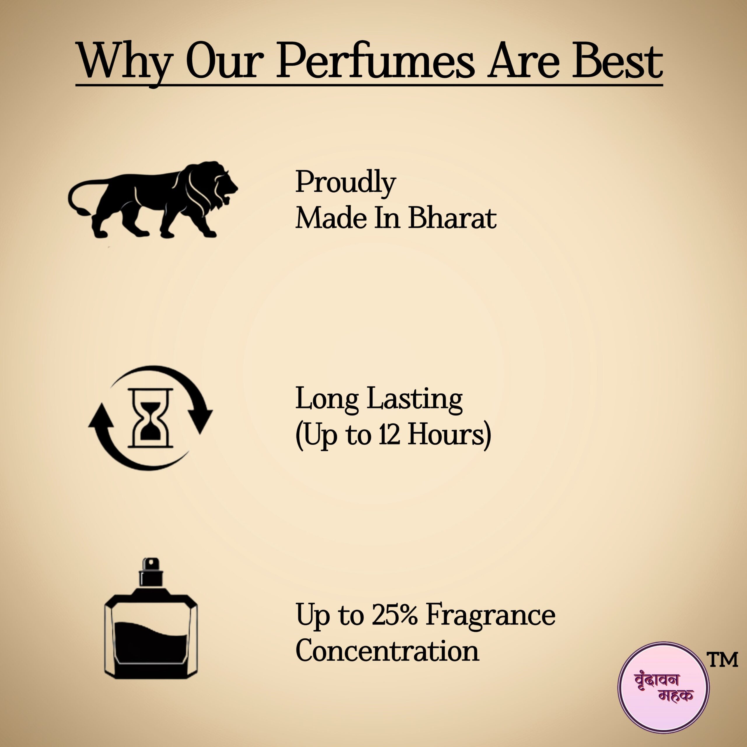 Soft and sweet 100ml perfume crafted with amber, musk, florals, and sandalwood. A premium, soothing best-seller from Vrindavan Mahak.