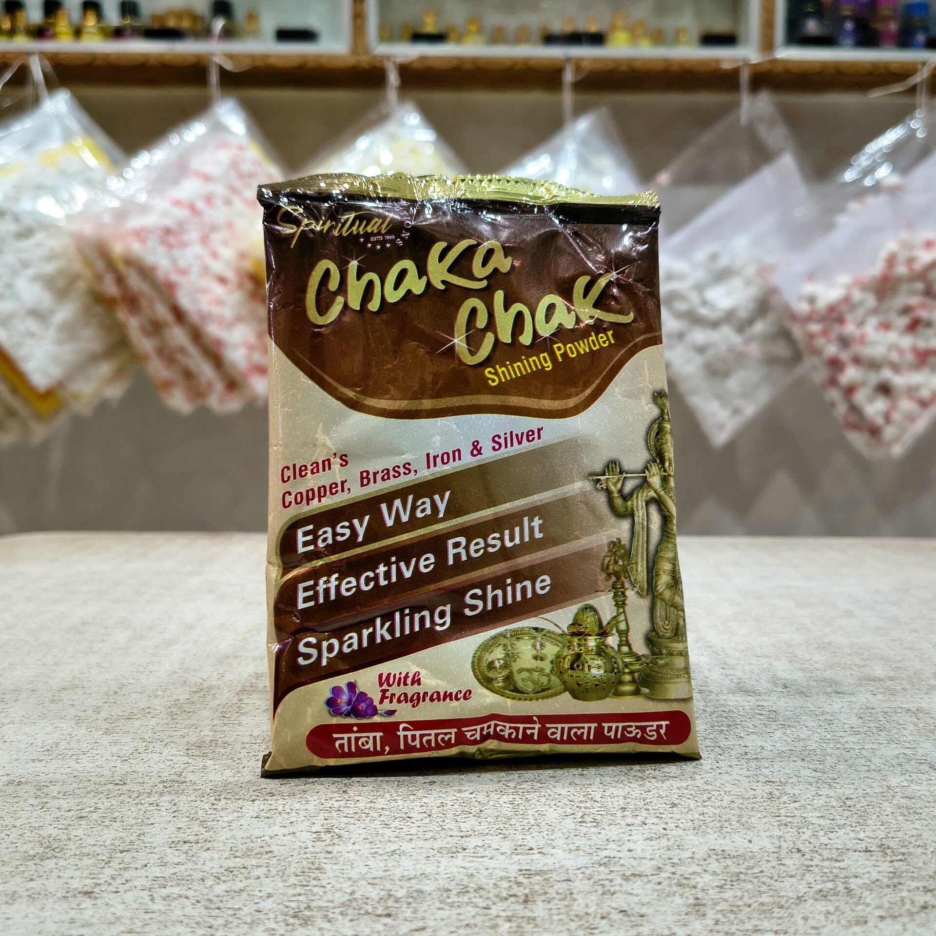 200 gm, Chaka Chak Powder cleans peetal, tamba, and pooja utensils with ease. Removes stains, restores shine, and keeps Thakur Ji’s bartan sparkling pure for rituals and daily worship.