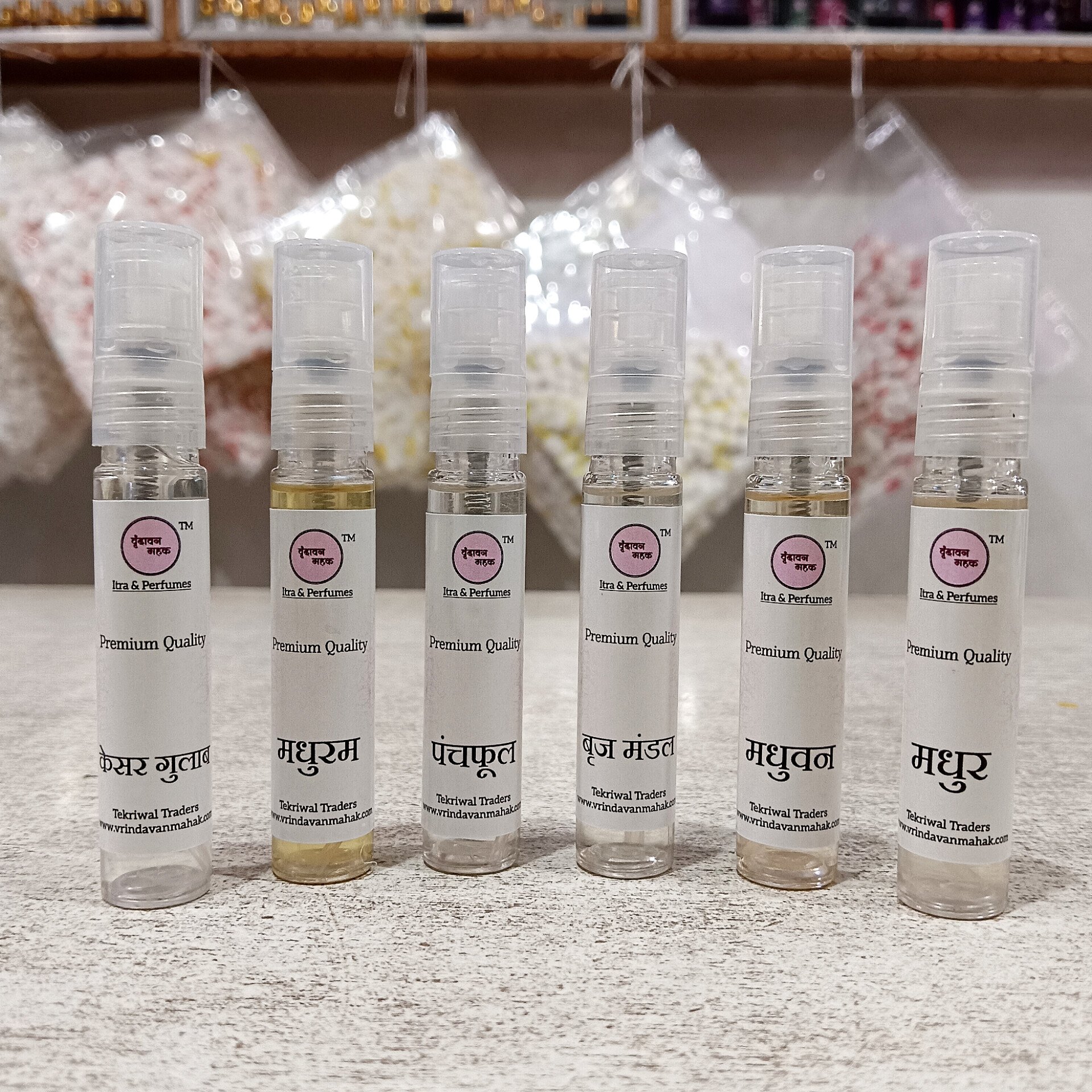 The Vrindavan Mahak Spiritual Perfume Combo features 6 premium-quality perfumes with sweet, comforting fragrances inspired by the spiritual essence of Vrindavan. Crafted for those who love soft, sugary notes, each perfume offers a long-lasting, joyful scent experience. Ideal for daily wear, religious rituals, or mindful moments, these unisex perfumes bring a sense of calm and charm. Made with high-quality ingredients, they make a perfect gift or personal indulgence. Smell sweet, feel divine—every day.