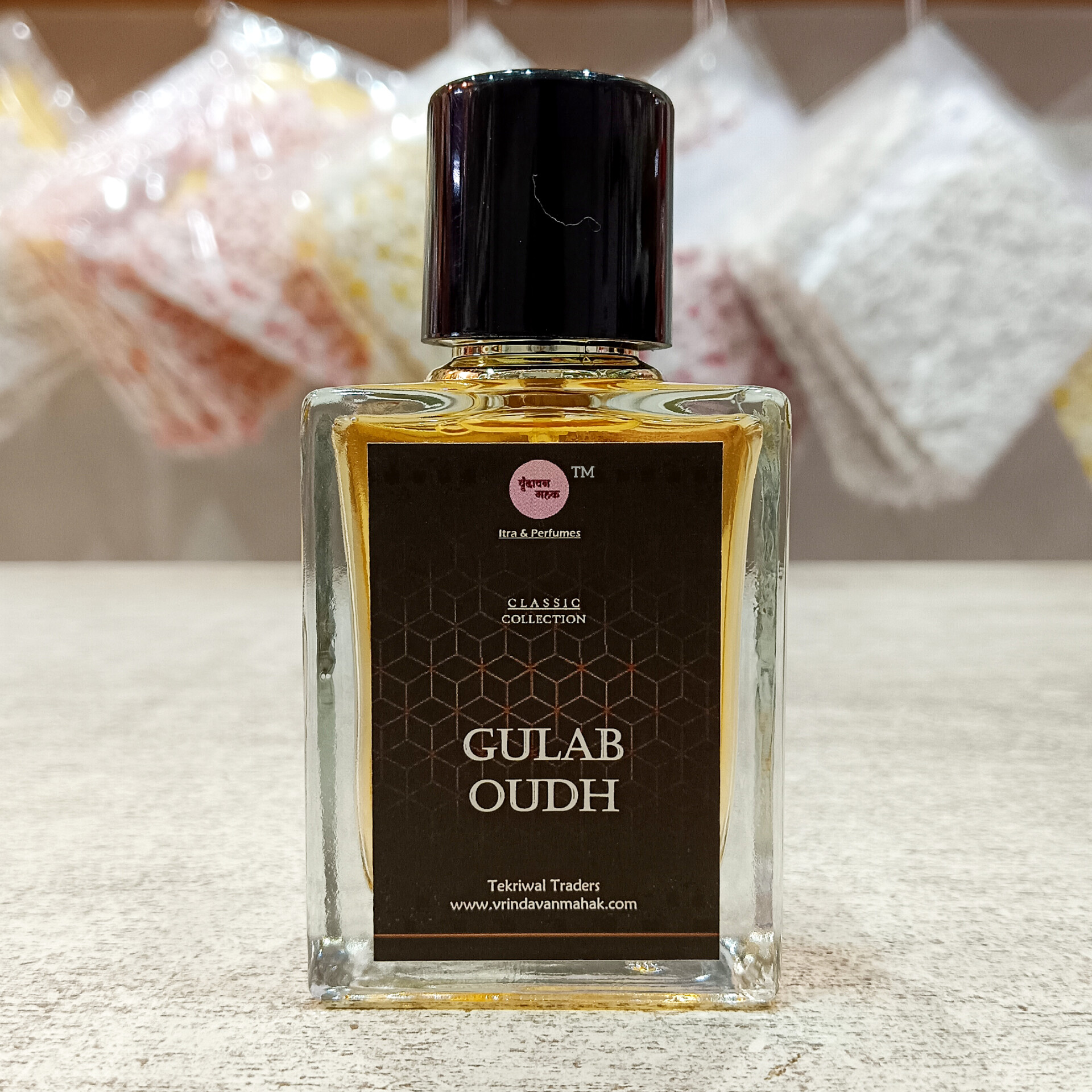 Gulab Oudh Perfume by Vrindavan Mahak blends the softness of rose with the richness of oudh. A captivating floral-woody fragrance that offers depth, elegance, and spiritual charm in every spray.
