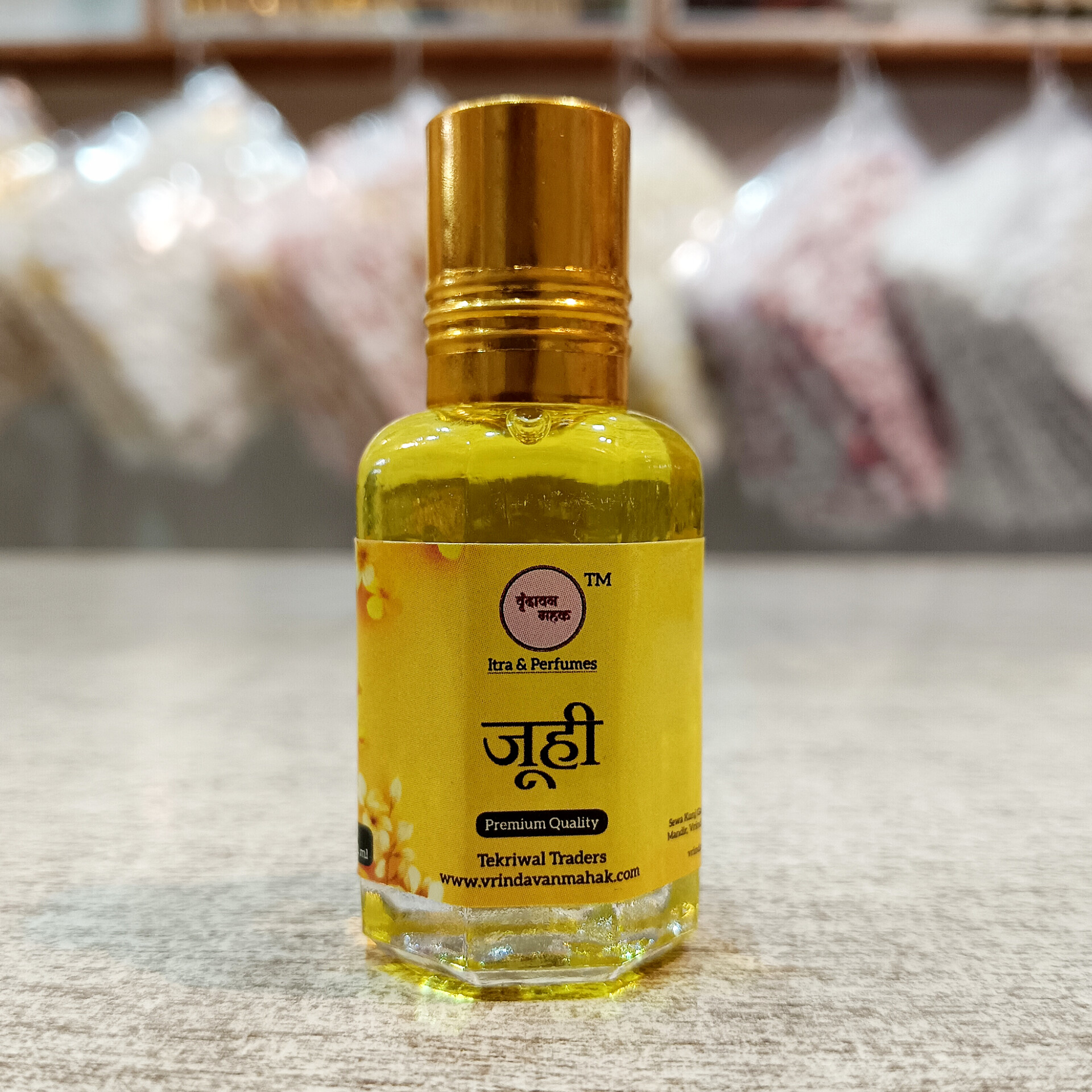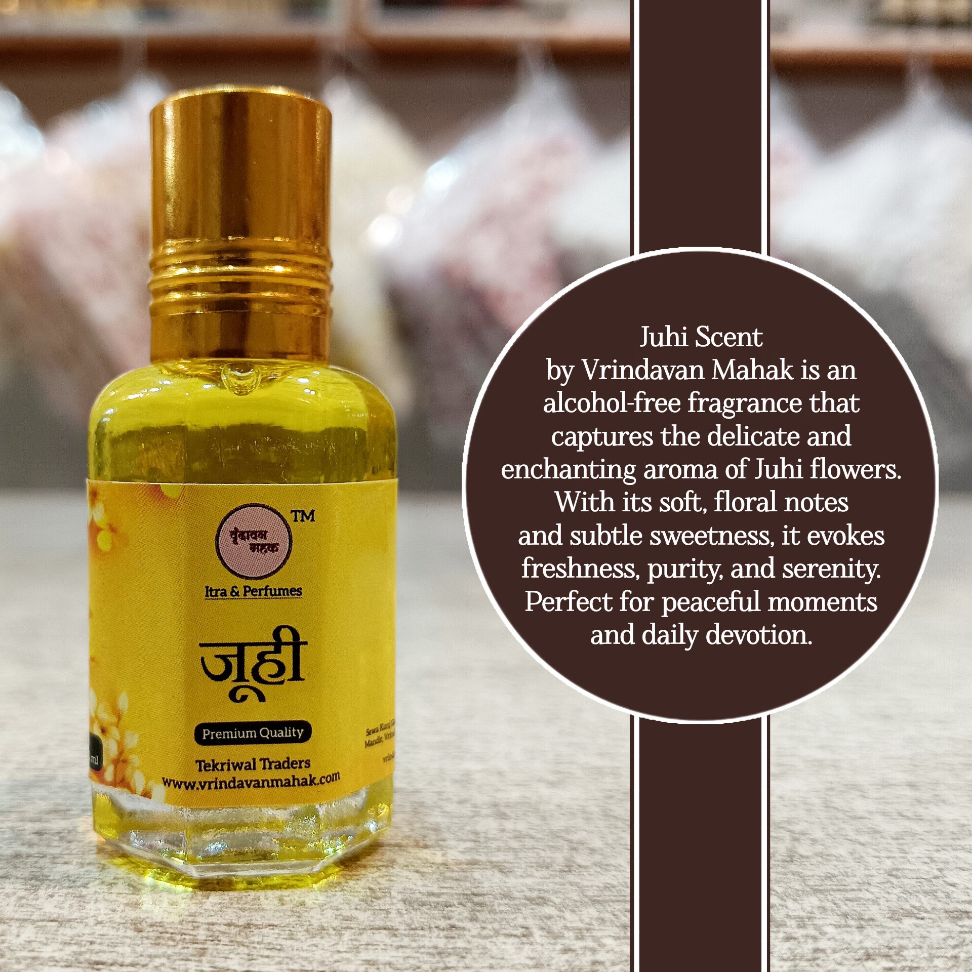Experience the delicate floral scent of Juhi with this alcohol-free roll on attar by Vrindavan Mahak. Made in Vrindavan, perfect for Laddu Gopal ji vastra sewa and spiritual rituals.