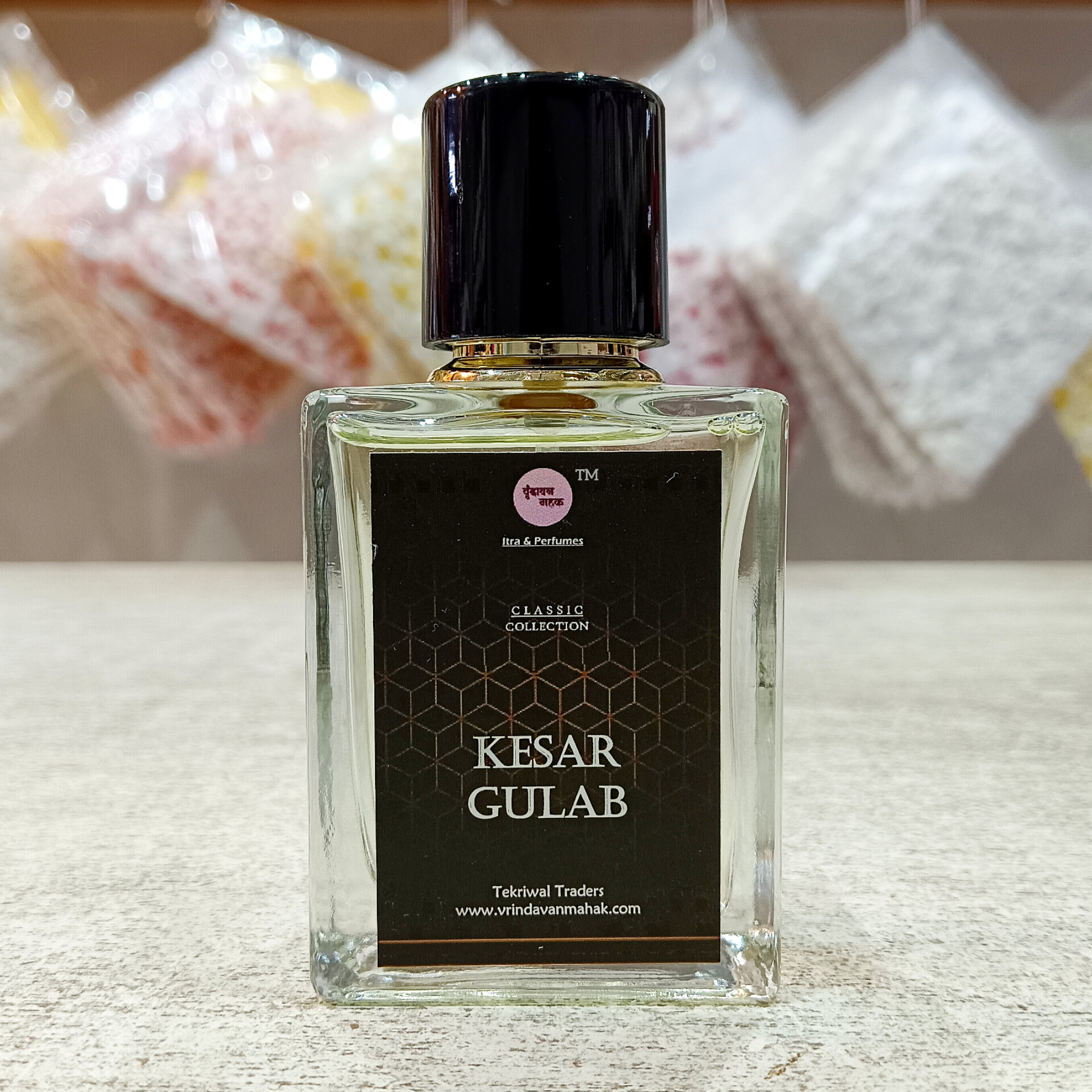 A graceful blend of rich saffron and blooming roses, Kesar Gulab Perfume by Vrindavan Mahak offers a luxurious floral aroma that brings both freshness and elegance in every divine spray.