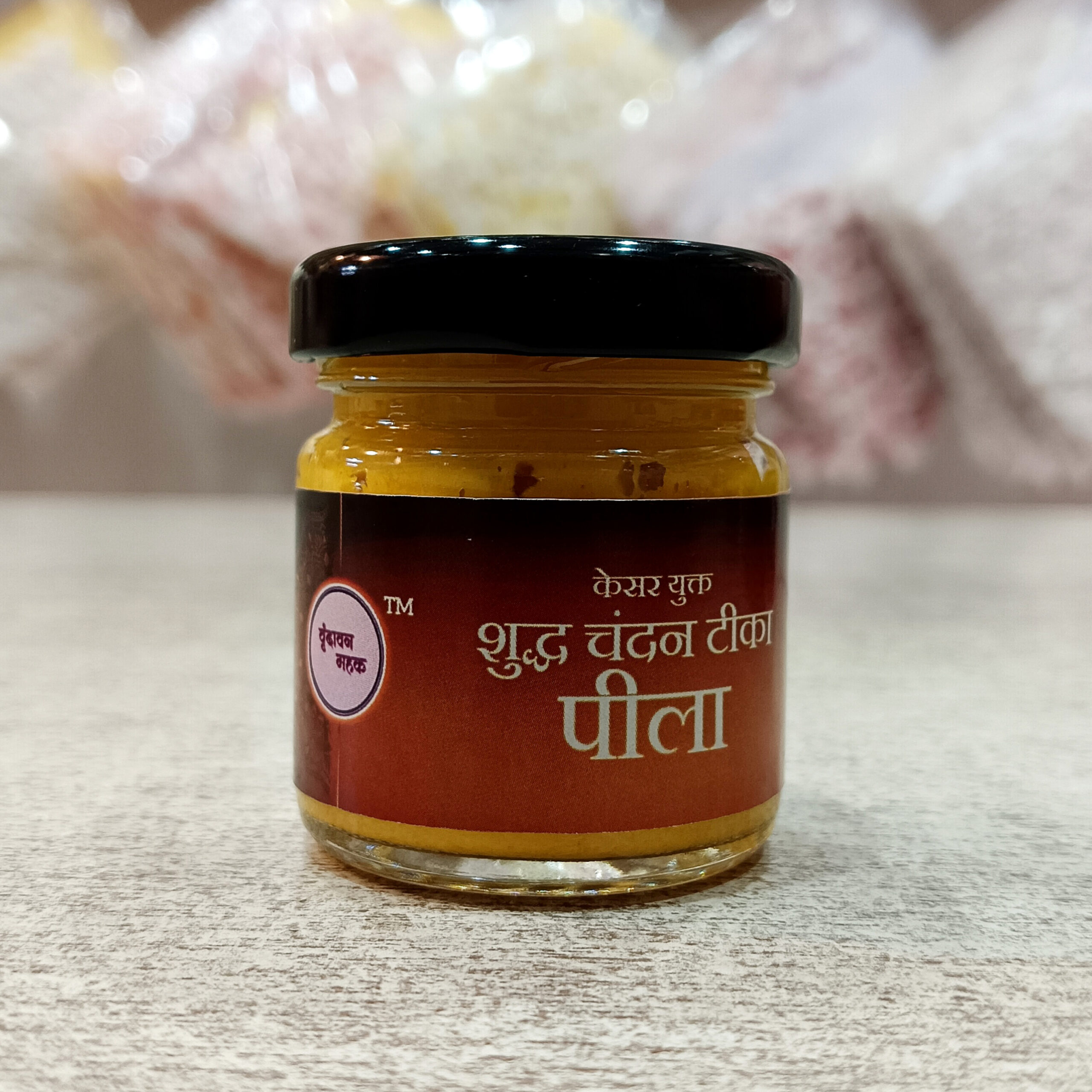 Kesar Yukt Peela Chandan Tilak – Liquid tilak with Kesar & fragrance, ideal for sacred rituals and pooja