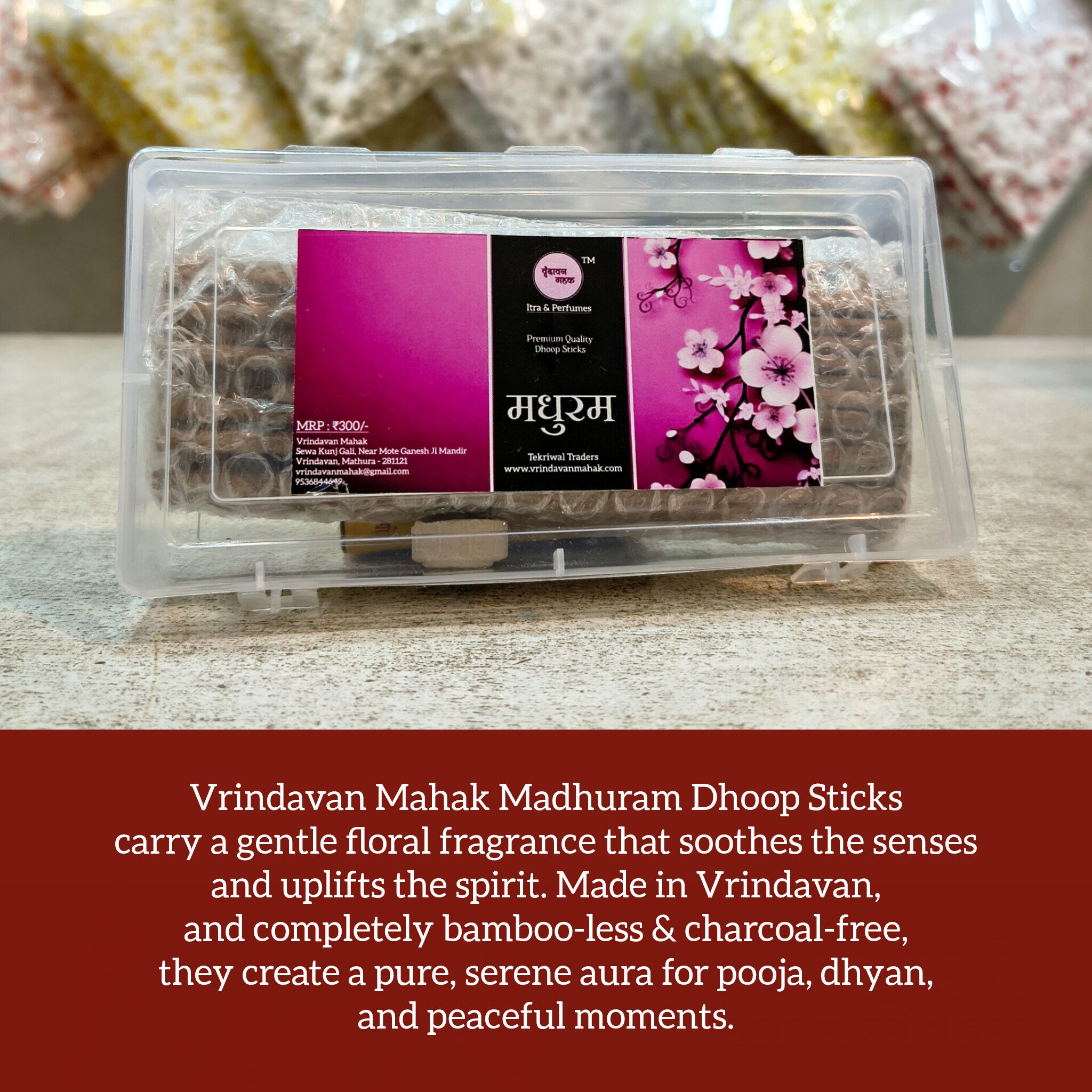 Gentle floral dhoop sticks from Vrindavan, bamboo-less and charcoal-free. Ideal for pooja, meditation, and creating a peaceful spiritual space.