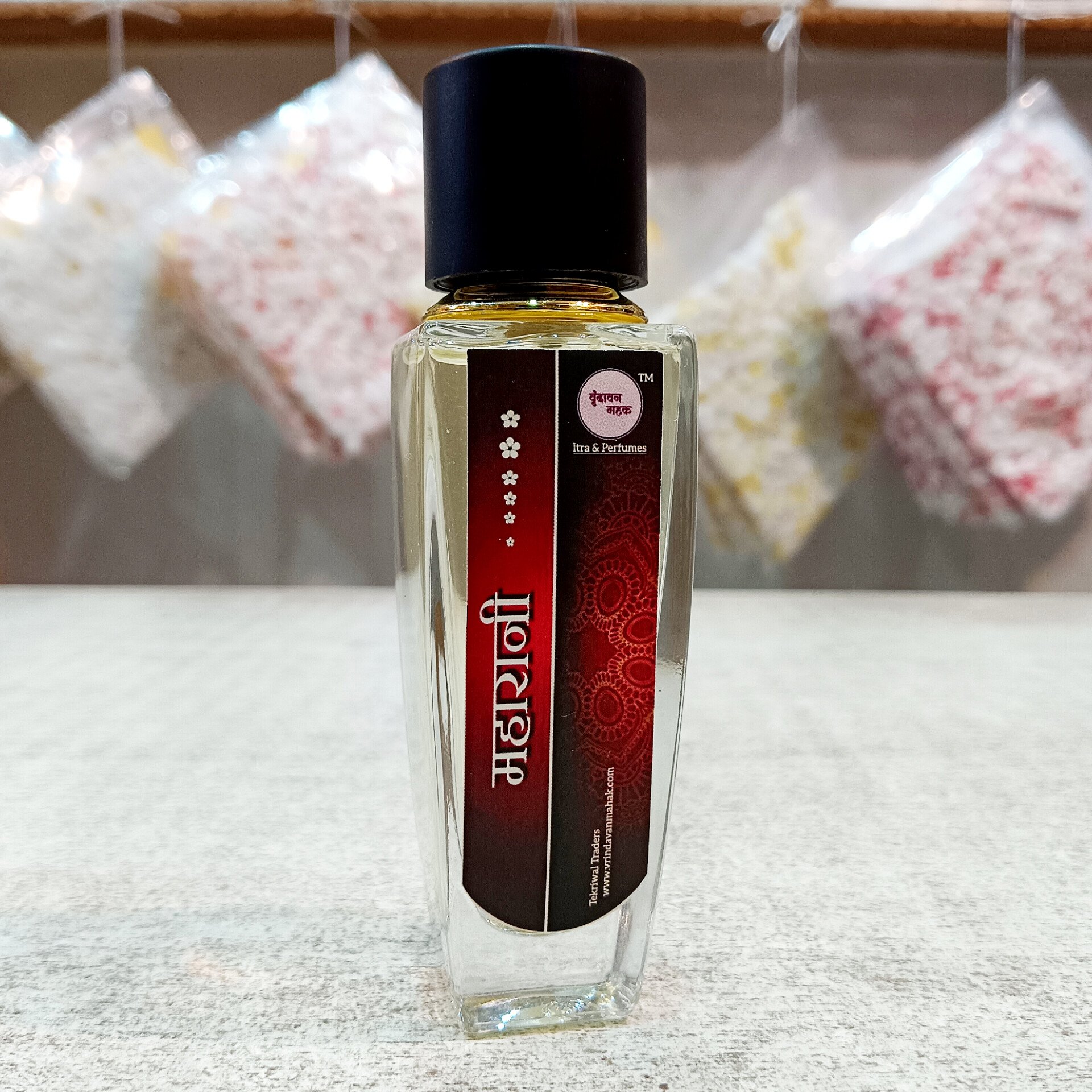Celebrate timeless grace with Maharani Perfume by Vrindavan Mahak. A royal blend of White Musk, Lotus, Oudh, Amber, Rose, fruity notes, and a regal touch of Kasturi.