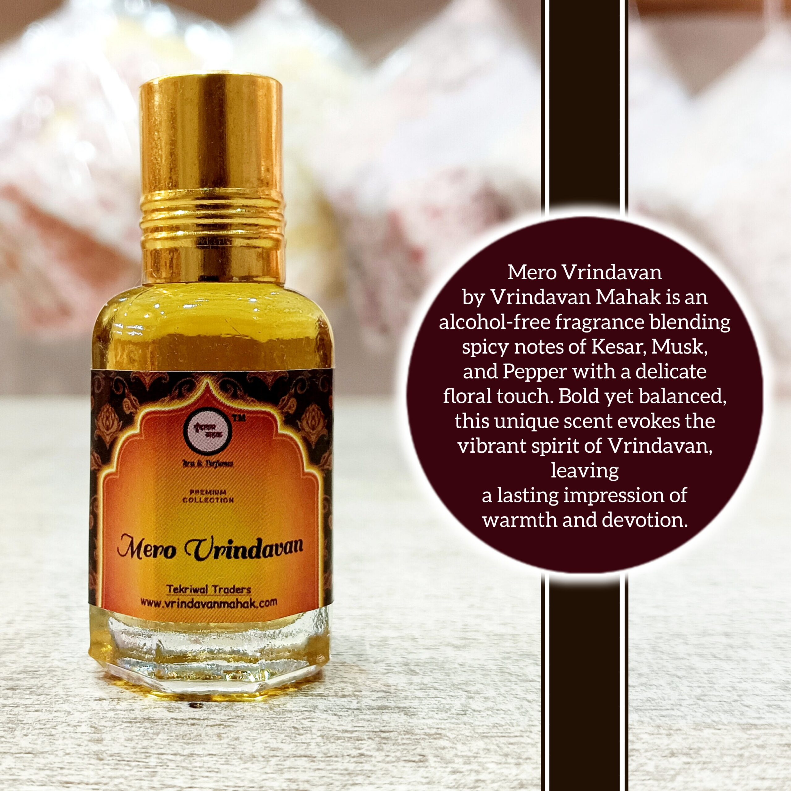 Mero Vrindavan Roll On Attar blends kesar, musk, and pepper in a warm, spicy composition with subtle floral hints. Designed to create a rich and devotional fragrance experience.