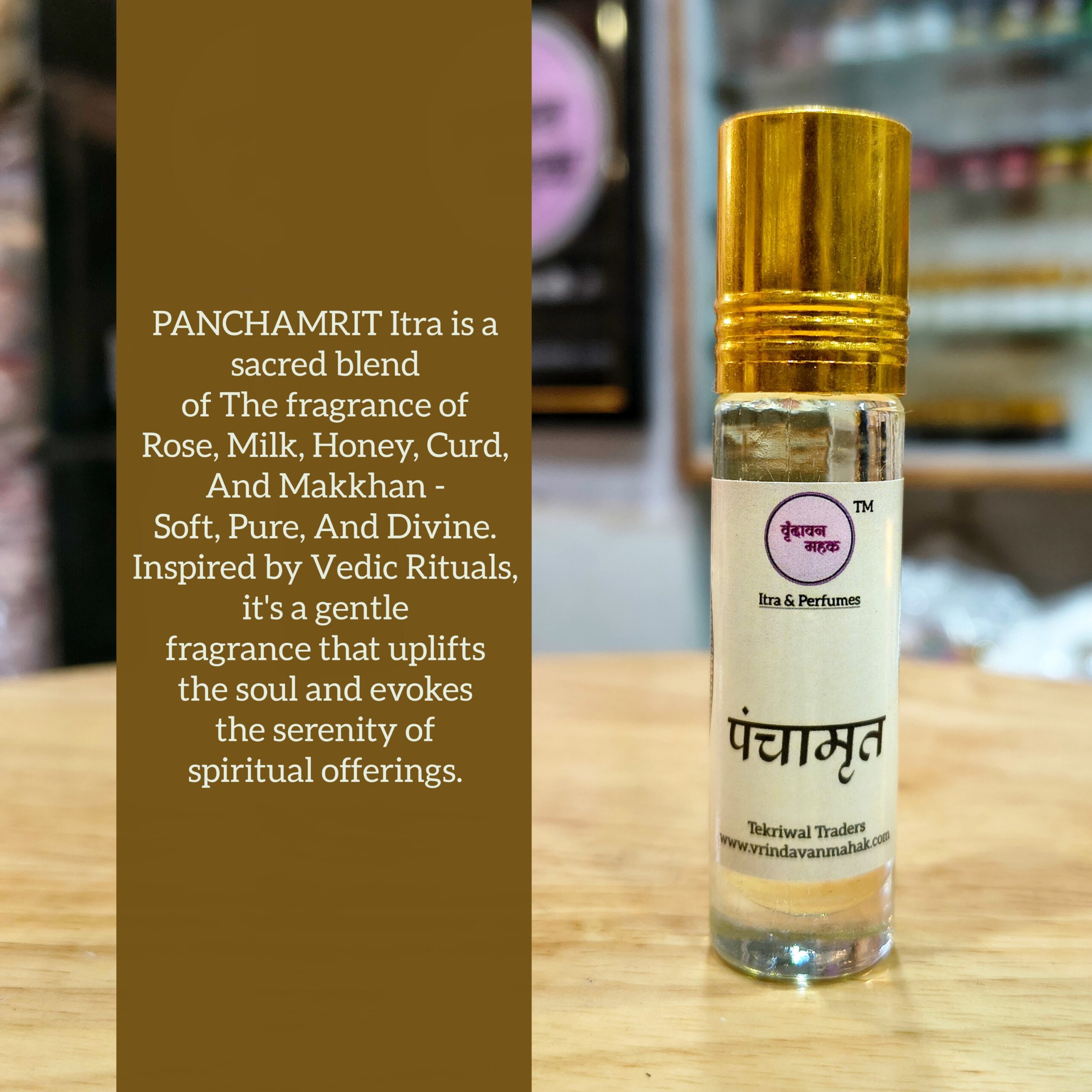 Experience the divine sweetness of Vrindavan with Panchamrit Itra (8ml). A sacred, sweet fragrance blending Milk, Honey, and Rose, symbolizing purity and the blissful nectar of devotion.