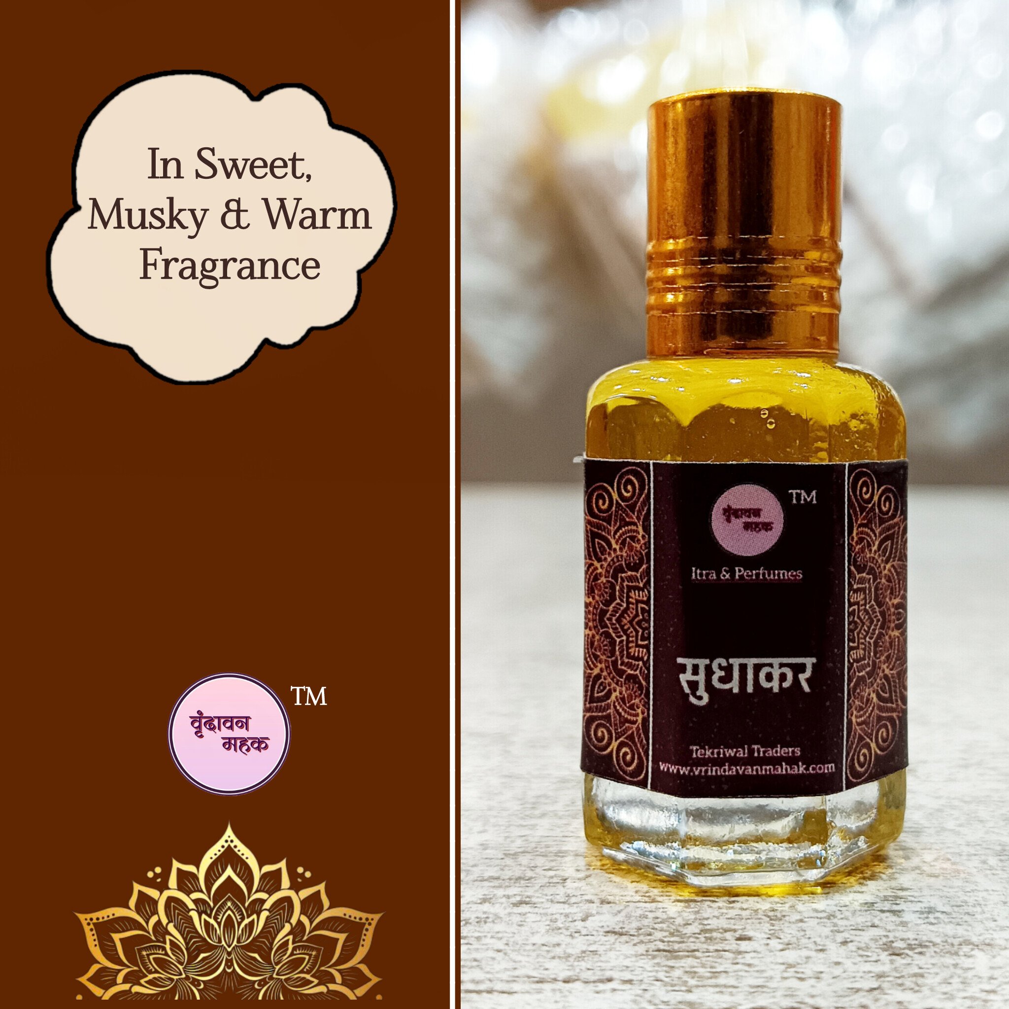 Sudhakar Roll On Attar by Vrindavan Mahak blends sweet amber, rose, white musk, florals, and sandalwood. This 12ml fragrance offers a warm, sweet and musky aura perfect for every occasion.