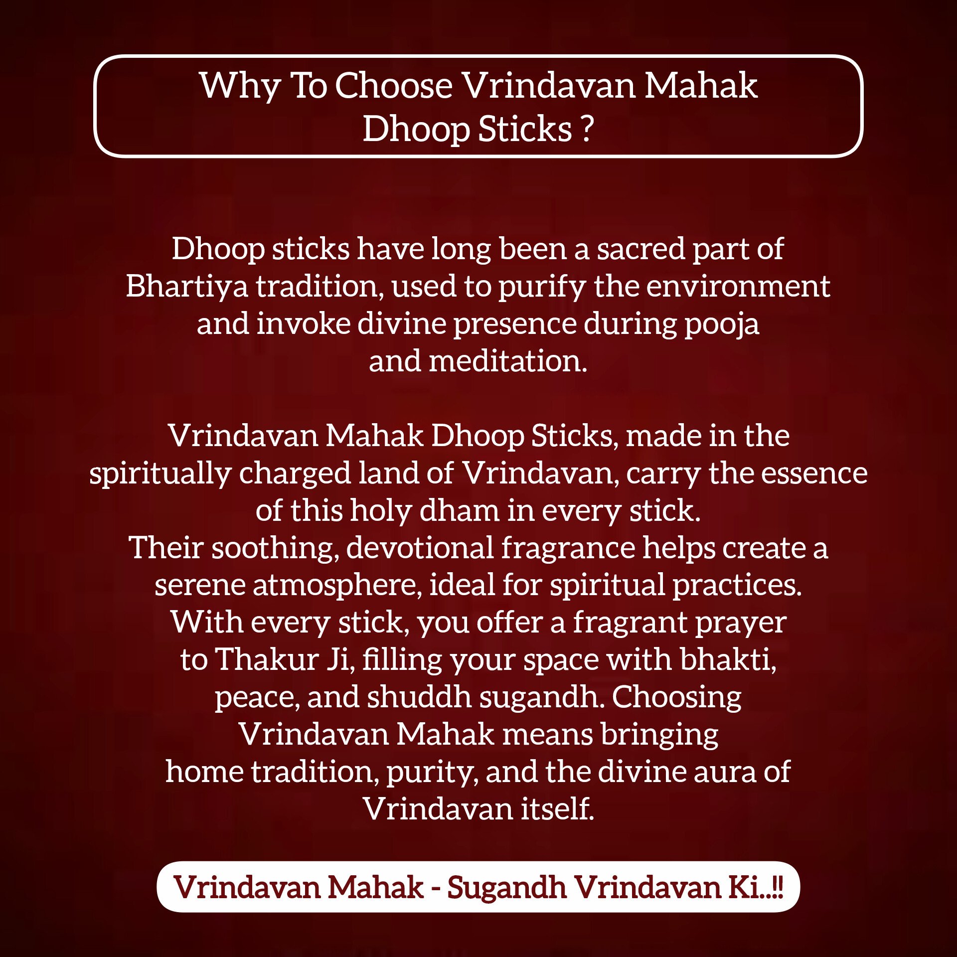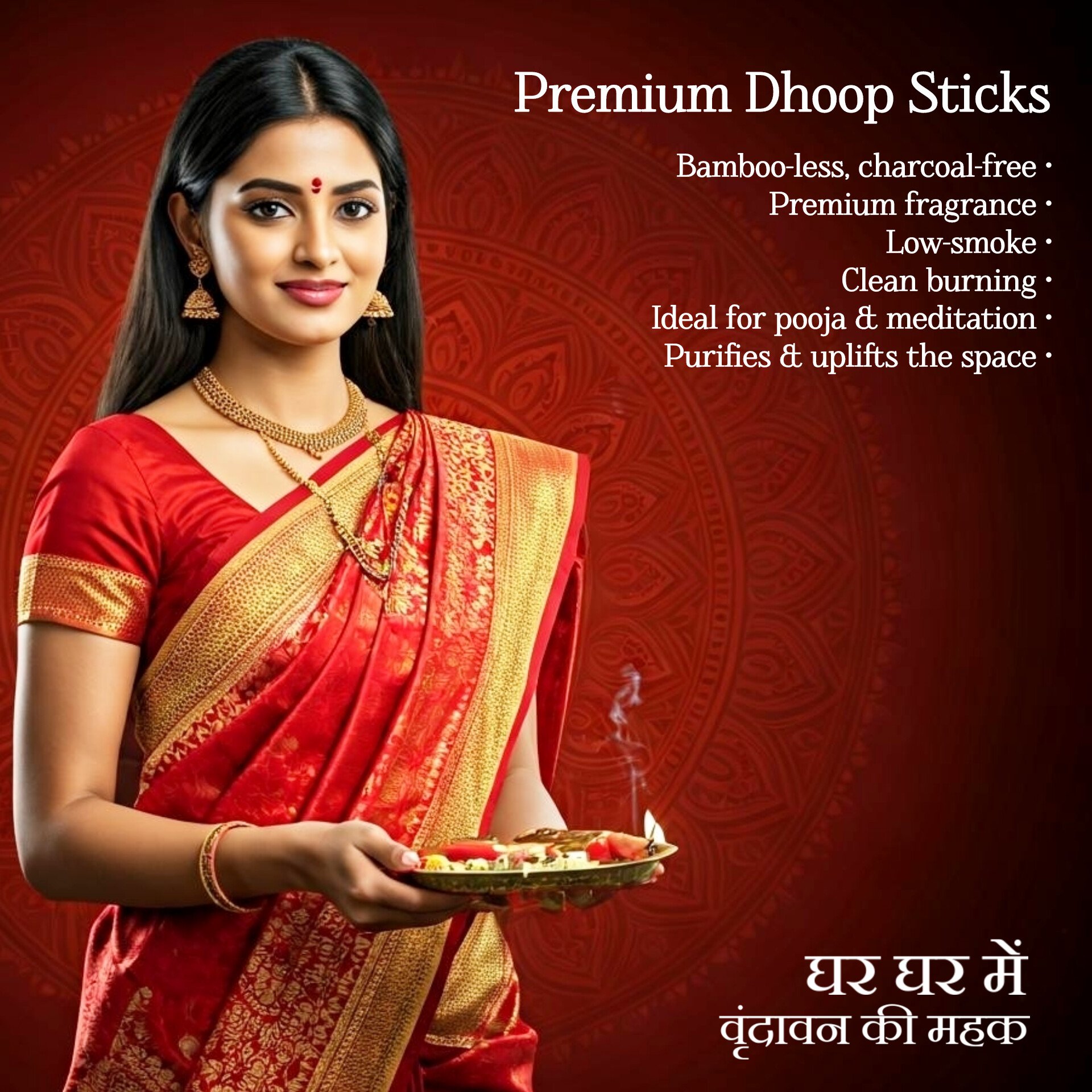 Vrindavan Mahak Sadhna 4 in 1 Dhoop Sticks bring variety to your daily worship with four premium floral fragrances in a single pack. Made in Vrindavan, each stick carries a soft, soothing aroma to match different moods of devotion. Bamboo-less and charcoal-free, these dhoop sticks ensure a clean, low-smoke atmosphere for your pooja or meditation. Their floral essence brings freshness and purity to your space, enhancing your connection with the divine. Perfect for homes, temples, and spiritual gatherings, Sadhna Dhoop is a fragrant companion to your spiritual journey.