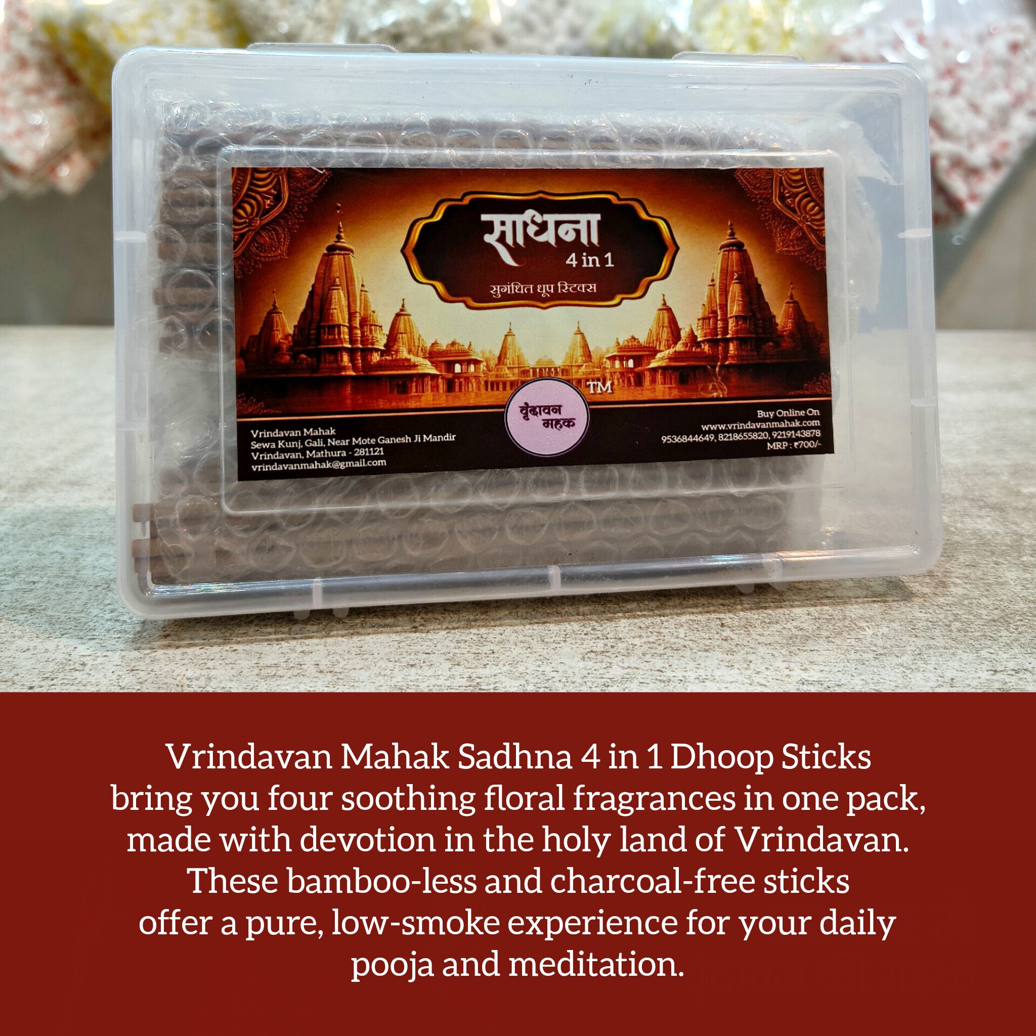 Vrindavan Mahak Sadhna 4 in 1 Dhoop Sticks | 4 Floral Fragrances | Bamboo-less & Charcoal-free | For Daily Pooja & Meditation