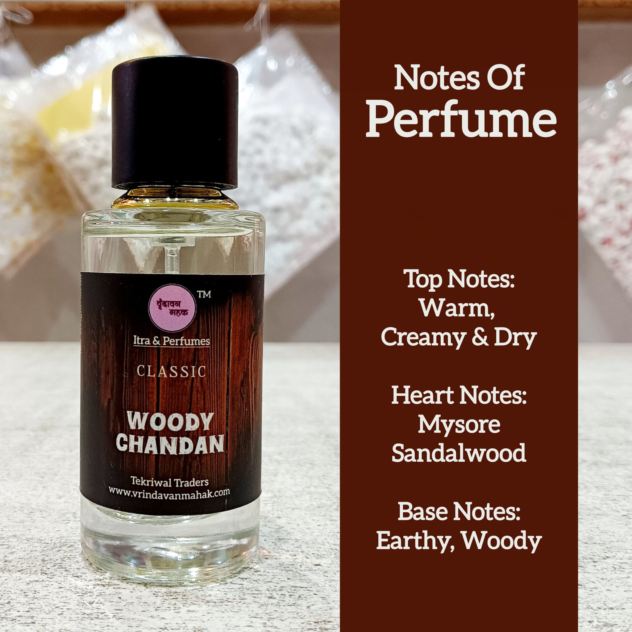 Woody Chandan Perfume by Vrindavan Mahak – 50 ml Pure Scent of Mysore Sandalwood with Earthy Base